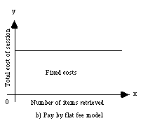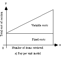 Figure 2 a) illustrates the pay per unit model adopted in the UK. Here the fixed costs include hardware and software purchase. The variable costs are determined by the amount of time that the user requires to complete their search tasks. This diagram shows a constant increase in costs for each unit of time that is consumed. 'Frequent-user' reductions may, in reality, reduce the cost of each additional unit of time after some specified threshold. After this point, the slope in Figure 2 a) would be reduced. In contrast, Figure 2 b) illustrates the flat rate approach. Here the fixed costs include the tariff imposed for all local calls. This must be paid irrespective of how much time the user spends in completing their search tasks.