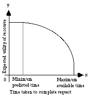 Recent experimental work in Econometrics has suggested ways in which March and Simon's pioneering research might be extended to consider individual attitudes to risk taking [8]. For example, Figure 3 characterises someone who is relatively impatient. They expect relatively low returns if the resource is not accessed within the initial moments of a request. Hence, they are more willing to abandon that request and move on. In contrast, Figure 4 represents a more patient approach. The user still expects to receive information with a relatively high value even as they approach the maximum available time for their search task. They will, therefore, be more reluctant to take the risk of abandoning their request and looking elsewhere.