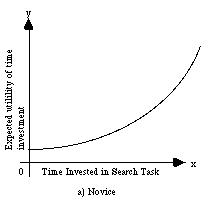 Figure 5 a) presents a concave curve. This represents the archetypal novice in the sense that relatively few rewards might be anticipated for time invested in a search until the user has identified relevant sources of information. Bergman confirms this when he reports that between 30 and 50% of novice users' requests result in 'no hits' [1]. Once users have identified appropriate sources of information, the returns will increase for each unit of time that is invested in the search activity. At some point the returns will begin to diminish as the available sources begin to 'dry up'. Figure 5 a) does not reflect this because novice's may continue to expect high rewards from sources that they have yet to find, even though those sources may not exist [12].