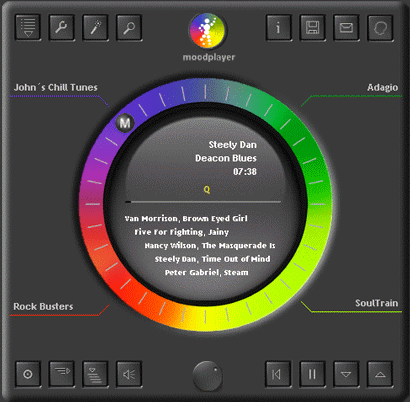 15. MP3 file selection via tap or accelerometer input. An implementation of the pointing without a pointer approach to selection, where the display modality is audio, and the input is tapping or shaking, depending on mode. The correlation between the rhythm of the track and the rhythm of the tapping is used to select the song. The ambiguity of the user's tapping is visible in the width of the red band at the top of the display.