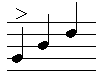 These are three quarter notes of increasing pitch. A note with a `>' above it is accented (played slightly louder than normal), with a `<' it is muted. A sequence of notes with a `<' underneath indicates that they get louder (crescendo) and with a `>' they get quieter (decrescendo). The height of the note on the stave indicates its relative pitch. This is only a very simple overview of musical notation.