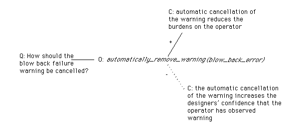 forall t , exists t': at(automatically_remove_warning(blow_back_error), t') <= at(state(blow_back, failed), t) ^ at(display(blow_back_error_icon), t) ^ at(system_cancel(blow_back_error_icon), t') ^ before(t, t'). (40)In previous papers, we have addressed these problems by developing literate specification techniques (Johnson, 1996a, 1996b). This approach uses the semi-formal argumentation of design rationale to support the use of formal methods during the systems development. Figure 1 illustrates this approach. Rank Xerox's Questions, Options and Criteria (QOC) notation is used to document the reasons why the previous clause might be adopted within the design of a particular system. QOC diagrams are built by identifying the key questions that must be addressed during the development of an interactive system (Buckingham Shum, 1995). The options that answer a particular question are then linked to it using the lines shown in Figure 1. Finally, options are linked to the criteria that support them, using solid lines, or weaken them, using broken lines. In Figure 1, the question of how to cancel blow-back warnings is answered by the design option that is specified by clause (40). This approach is justified by the criteria that the automatic cancellation of warnings reduces burdens on system operators. It is not supported by the criteria that this helps the operator to observe the warning. The diagram shown in Figure 1 is relatively simple in that it only shows a single option for the design question. In practice, these diagrams tend to show a number of alternative clauses each of which represents a different design option for the problem being considered. The interested reader is directed to Johnson (1996b) for more detail on the application of this approach.