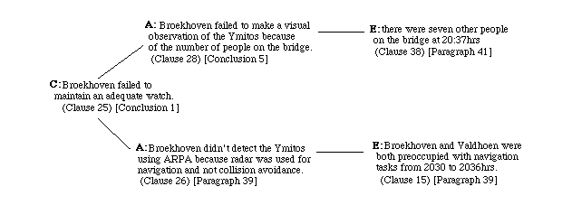 <=> not during(observe(broekhoven, mount_ymitos, visual), t) ^ not during(observe(broekhoven, mount_ymitos, arpa_radar),t) ^ before(t, 2040). [DeMorgan's Law (23)] (24) <=> (not during(observe(broekhoven, mount_ymitos, visual), t) ^ before(t, 2040)) ^ (not during(observe(broekhoven, mount_ymitos, arpa_radar), t) ^ before(t, 2040)). [^ Identity (24)] (25)In order to justify Conclusion 1 we must consider two different cases. The first concerns the reasons why Broekhoven failed to make visual contact with the Mount Ymitos. The second addresses the failure to detect the Ymitos using the ARPA radar. In order to establish the connection between the conclusion and the evidence presented in the body of the report it is necessary for analysts to explicitly state the reasons supporting particular findings. For example, one of the reasons why Broekhoven failed to observe the Mount Ymitos was that he used the radar for navigation and not for collision avoidance: