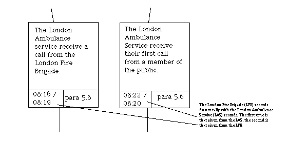 A limitation with the approach shown in Figure 9 is that it does not account for the inconsistencies that may arise in any accident reporting process. Experience in applying AFT diagrams has shown that witnesses may frequently report different timings for key operator 'errors' or system 'failures'. In order to address such uncertainty, Figure 10 illustrates an annotation technique that we have used to explain potential contradictions in a timing analysis. This technique has proved particularly useful as it provides a focus for the detailed investigation of the timing evidence that is presented in a conventional accident report.