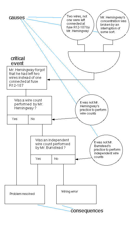 There are a range of important differences that distinguish the use of accident fault trees from their more conventional application. Fault trees are constructed from events and gates. However, many accidents are caused because an event did not take place (Reason, 1990). These errors of omission, rather than errors of commission typify a large number of operator 'failures'. Figure 4 illustrates the way in which fault-trees can be used to represent these errors of omission; Mr Hemmingway failed to perform a wire count, Mr Hemmingway's boss failed to perform an independent wire count.