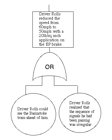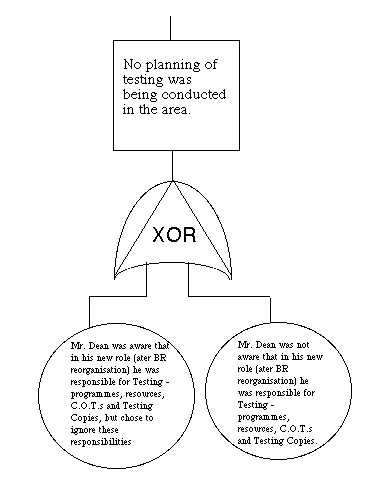 The output of an OR gate is true if and only if at least one of itıs inputs is true. An OR gate can be used in an accident fault tree to represent a lack of evidence. Evidence can be removed accidentally or deliberately from an accident scene. Alternatively, evidence may be missing because the person holding the information died in the accident. For example, in the Clapham accident, we do not know if Driver Rolls actually noticed the irregularity of the signals he passed. The output of an XOR (exclusive OR) gate is true if and only if exactly one of the inputs are true. They are useful in accident fault trees when we know an intermediate event was caused by either of two events, but not both. This again raises an important semantic difference between our use of the Fault Tree notation and its more usual application to risk analysis. In particular, if both of the initial events are true in our interpretation then the intermediate event does not happen. This contrasts with the more conventional interpretation, of an XOR gate in which mutual exclusion is guaranteed. We retain our interpretation here because if it were found that both initial events were true then any subsequent analysis based on the XOR gate would have to be substantially revised. Figure 5 shows how an OR gate can be used to represent two reasons why Driver Rolls reduced his speed; either he was concerned about the behaviour of the signalling system or he saw the train ahead of him brake. It also illustrates the use of an XOR gate. There was no testing plan for the signalling system in this area because either a key official ignored his responsibilities or he was not aware that he was responsible for this task.