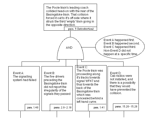 Further differences between conventional fault trees and accident fault trees arise from the semantics of the gates that are used to construct the diagrams. Conventionally, the output from an AND gate is true if and only if all of its inputs are true. Accidents cannot be analysed in this way. For example, Figure 4 shows that the hardware error was the result of six events. In a 'traditional' fault tree the error would have been prevented if interface designers or systems engineers had stopped any one of these events from happening. In accident analysis, however, there is no means of knowing if an accident would actually have been avoided in this way. Most accident reports do not distinguish between necessary and sufficient conditions. An accident may still have occurred even if only one or two of the initiating events occurred. In this context, therefore, an AND gate represents the fact that an accident report cites a number of initiating events as contributing to the output event. No inferences can be made about the outcome of an AND gate if any of the initiating events do not hold.