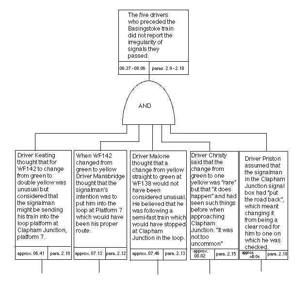 In Cause consequence analysis, separate diagrams are required for each critical event. Unfortunately, in an accident, there may be dozens of contributory factors and so several diagrams will be required. For instance in the Clapham accident, other diagrams would be required to represent the causes and consequences of bad working practices, limits on safety budgets and the events on the day of the accident. Such characteristics frustrate the application of these diagrams to represent and reason about the complex interaction between human and system failure during major accidents.