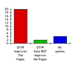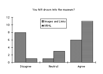 A series of web pages were developed to provide users with access to models such as that shown in Figure 8. The results shown in Figure 9 were obtained by showing the resulting pages to people in the Museum itself. At first, we were worried that the Hawthorne effect might have biased our results. Visitors might have been too enthusiastic because we were clearly demonstrating 'new technology'. However, it is interesting to note that even under these conditions there were users who were prepared to state that the QuicktimeVR exhibits added nothing to the web pages, The graph on the right presents the reasons given by those who said that the QuicktimeVR exhibitions did add something to the Museum's web pages. Yet again, these initial findings are challenging our assumptions. The motivational impetus of keeping attention for longer is less important that providing a greater 'feel for the object'. Of course, these findings are not statistically significant. Nor could they be when we deliberately chose to monitor 'real' users interacting on the Museum floor. They are, however, indicative of the pressing need to perform more research in this area. Our experience of building desktop VR systems is unlike any other in the field of HCI, previous biases and assumptions about user performance and behaviour are being continually challenged.