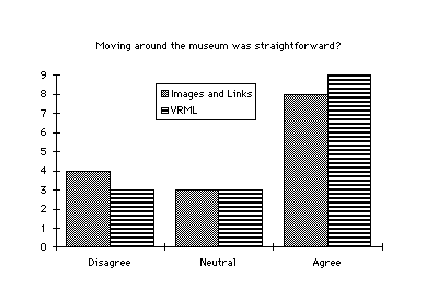 Perhaps the most striking feature of Figure 7 is the similarity between the two sets of results. Users reported few difficulties in navigating both the VRML model and the image-mapped interface. Again, this came as a considerable surprise. Many aspects of the VRML browsers are counter-intuitive. Our users had little or no experience of navigating through complex three dimensional spaces using keyboards and mice. They only received a minimal training session before interacting with the Gallery. Perhaps more surprising still is that 'think aloud' evaluations revealed that many of our users felt considerable frustration about the navigation facilities that both systems offered even though they stated that it was 'straightforward' to move around the Museum. As with task fit, our findings suggest that our previous experience with two dimensional interfaces leaves us spectacularly ill-equipped to understand what is going on during interaction with three dimensional systems. Our intuitions often prove false and users often contradict our initial understanding of complex interactions.